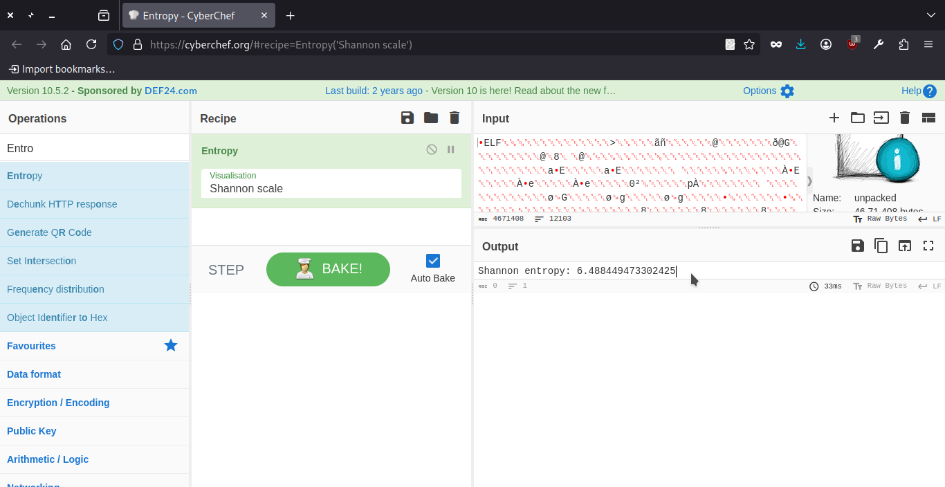 then go to cyberchef and select the entropy and file (In my case file name is unpacked you can named as per your choice) as input file and upload it.