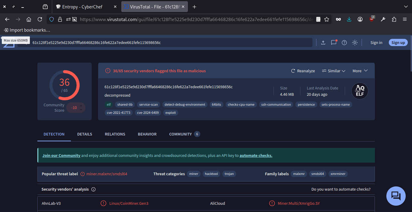 Now, upload the same file that upload on cyberchef to the virustotal and it get some of the results such that