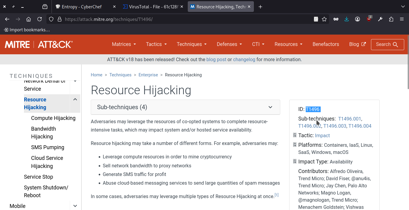 Given this behavior, I searched for the corresponding MITRE ATT&CK technique related to unauthorized cryptomining activity. This led me to the technique: Resource hijacking