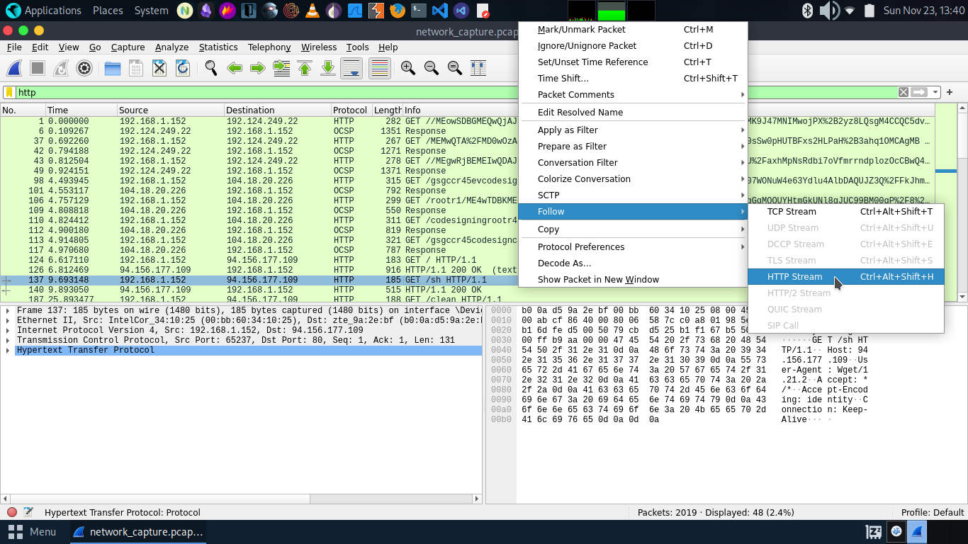 In most of the cases attacker trying to do any malicious activities from the HTTP/HTTPS type of requests.So analyse it on wireshark use the filtering the traffic by just type the http on it.Now it’s shows only http traffic so on the first of the traffic it easily shows the IP is 192.168.1.152