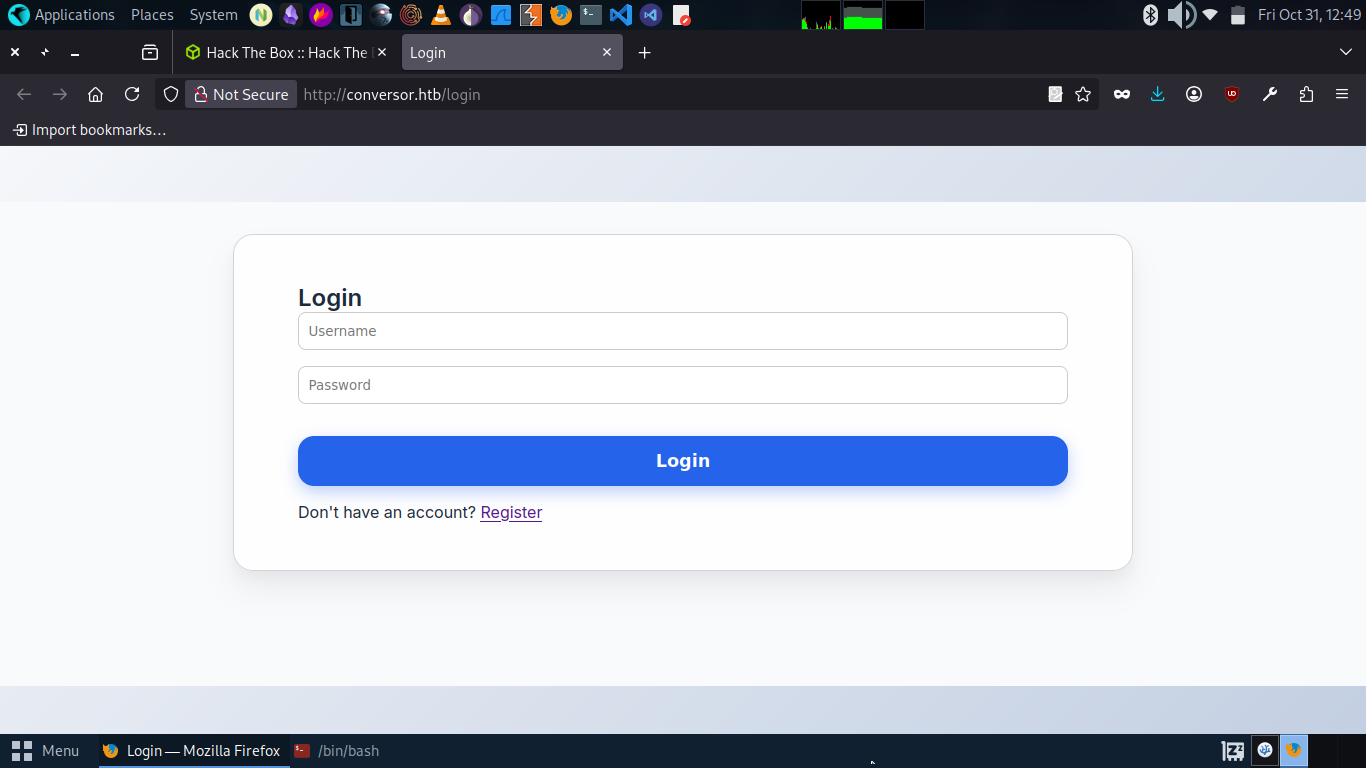 Visiting http://conversor.htb/, there is not much; we only see two buttons: