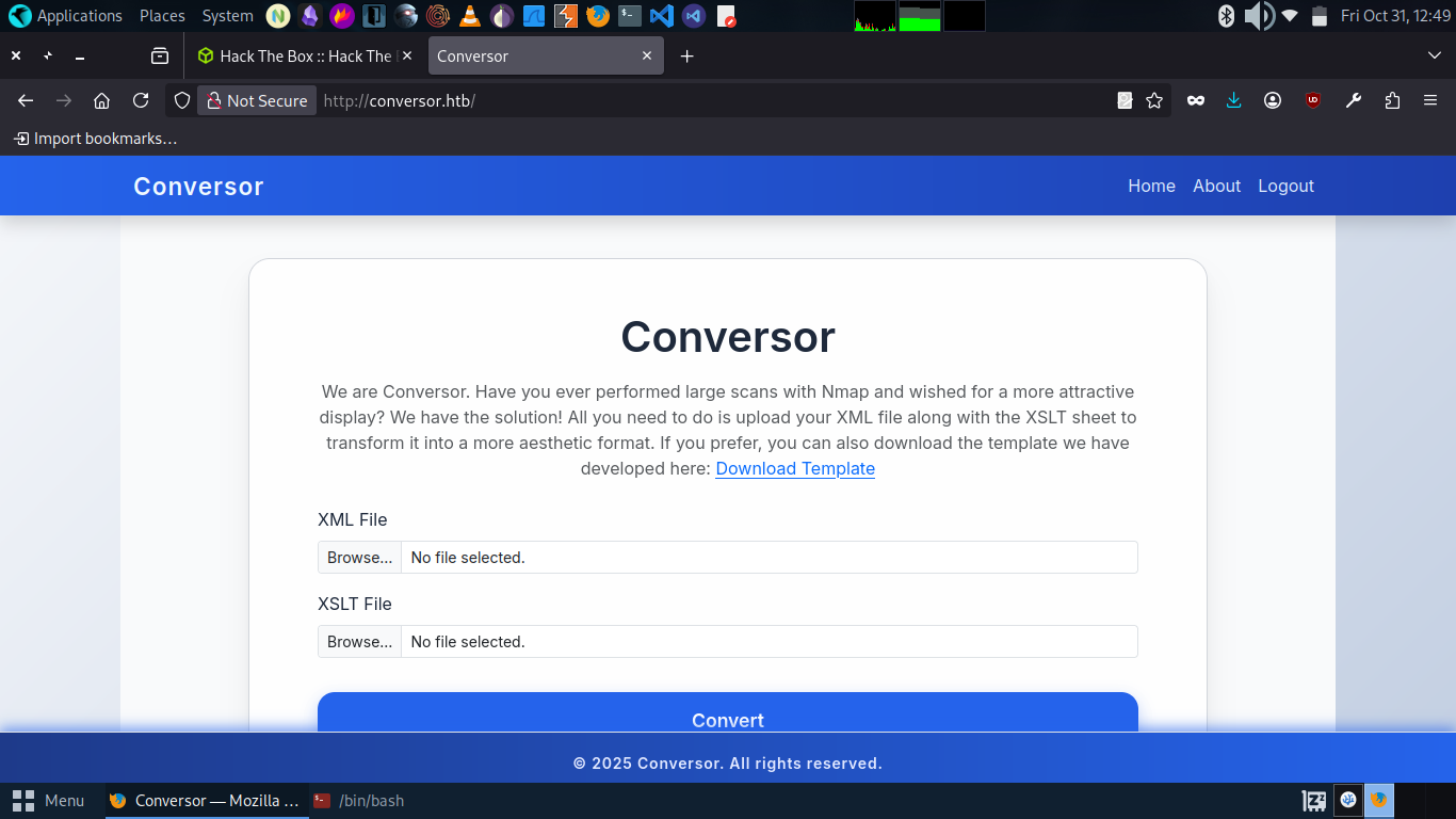 We are also provided with the conversor.htb hostname in the box, so we add it to our hosts file: